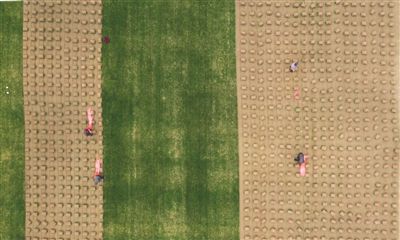 长江太仓市璜泾镇江边,绿化工人在江滩采收草坪。计海新 摄